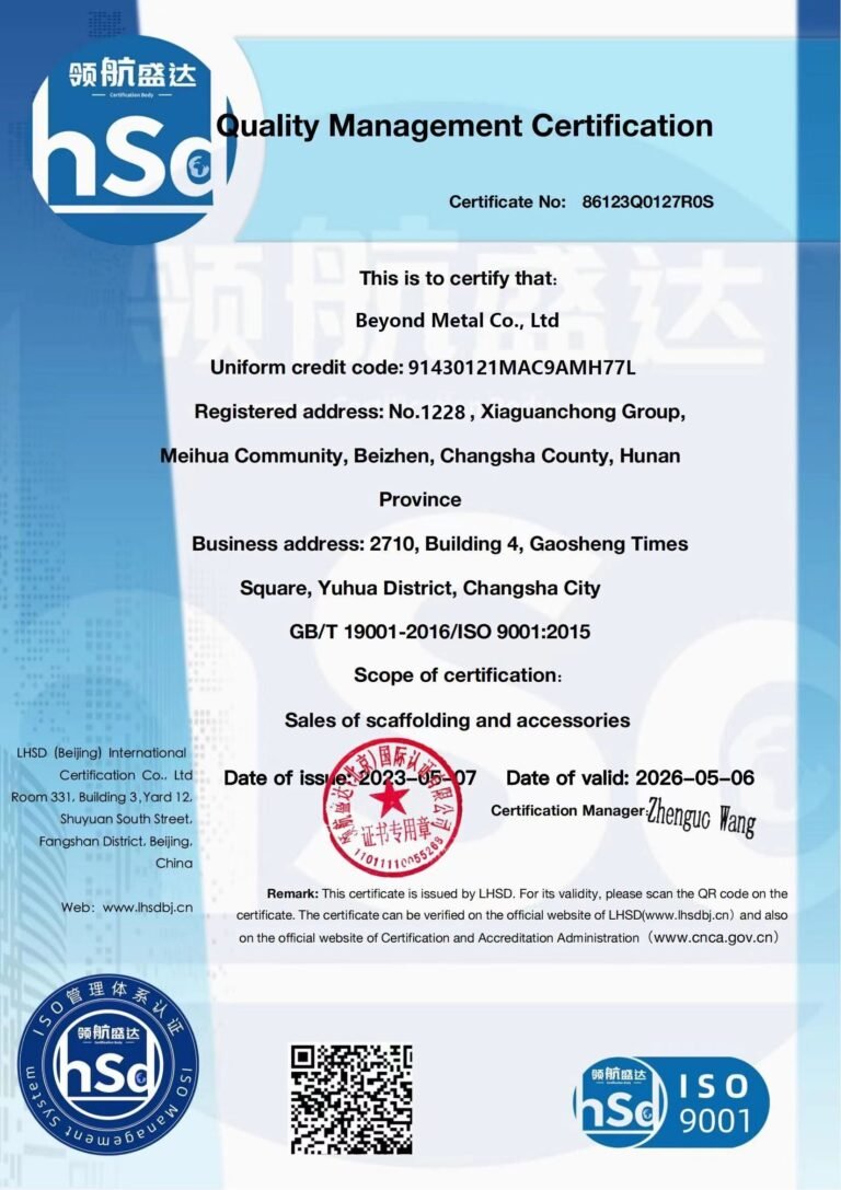 Beyond Metal is committed to quality and safety, holding certifications such as CE, EN-1090, ISO14001, and OHSAS18001. Our rigorous quality control processes include third-party testing by SGS and TUV, ensuring our products meet the highest industry standards. Trust Beyond Metal for reliable, certified scaffolding solutions that prioritize your project’s success.